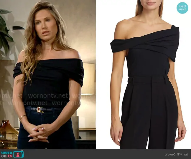 Heather Stevens (played by Vail Bloom) on The Young and the Restless on CBS was spotted wearing this black off-shoulder top on The Young and the Restless on Sep 06 2024's episode. Heather's Top is the Asymmetric Off-The-Shoulder Top by Rohe.
