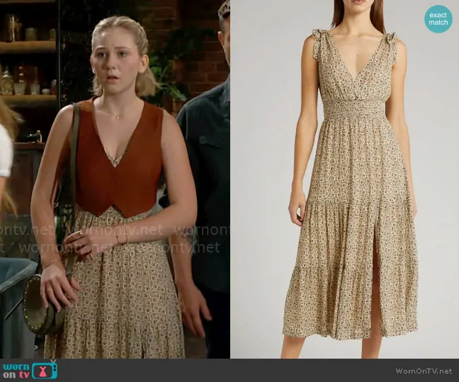 Lucy Romalotti (played by Lily Brooks O’ Briant) on The Young and the Restless on CBS was spotted wearing this beige paisley maxi dress and cropped vest on The Young and the Restless on Sep 06 2024's episode. Lucy's Dress is the Karlissa Dress in Butter / Black by Paige . Lucy's Vest is the Cropped V-Neck Vest in Dark Cocoa by Forever 21 . Lucy's Bag is the Studded Crossbody by GAP.