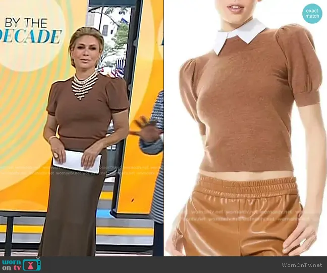 Jill Martin on Today on NBC was spotted wearing this brown puff sleeve top on Today on Sep 06 2024's episode. Jill's Sweater is the Chase Sweater Knit Top with Removable Collar by Alice + Olivia.