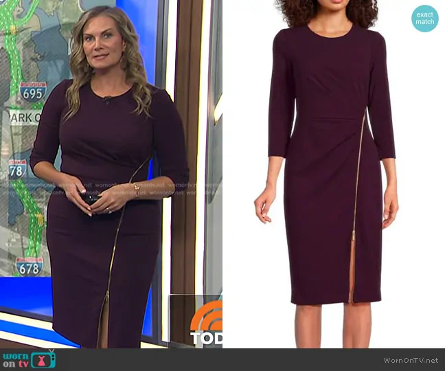 Emily West on Today on NBC was spotted wearing this purple zip dress on Today on Sep 06 2024's episode. Emily's Dress is the Zip Sheath Dress in Aubergine by Calvin Klein.