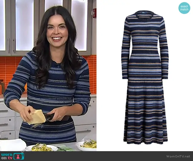 on Today on NBC was spotted wearing this blue striped knit dress on Today on Sep 06 2024's episode. 's Dress is the Stripe Crewneck Maxi Sweaterdress in Blue Multi by Polo Ralph Laure.
