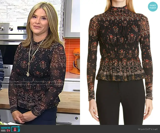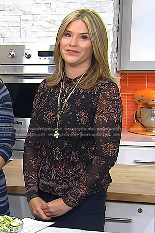 Jenna Bush Hager on Today on NBC was spotted wearing this black floral peplum mesh top on Today on Sep 06 2024's episode. Jenna's Top is the Mesh Shell Long Sleeve Top by Rebecca Taylor.