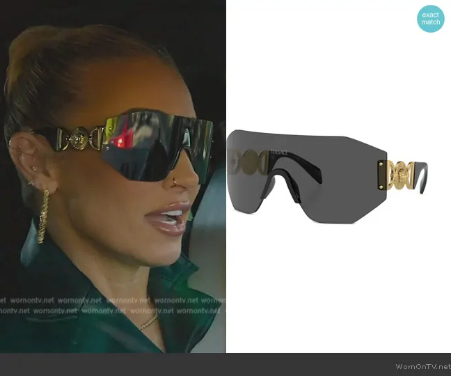 Mary Fitzgerald on Selling Sunset on Netflix was spotted wearing this shield sunglasses on Selling Sunset on episode 'The Girls are Back in Town' (8x01) in Sep 2024. Mary's Sunglasses is the Oversized Shield-frame Sunglasses by Versace.