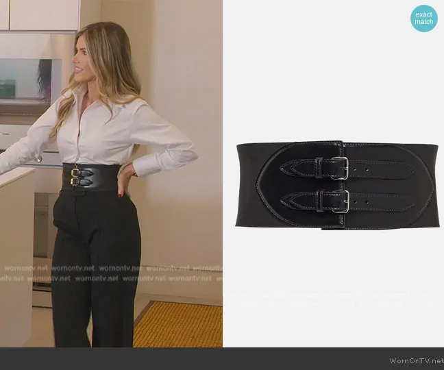 on Selling Sunset on Netflix was spotted wearing this black wide leather belt on Selling Sunset on episode 'Cat’s Out of the Birkin Bag' (8x03) in Sep 2024. 's Belt is the Buckled leather corset belt by Alaia.