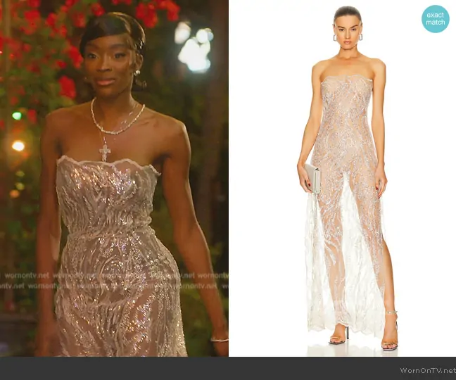 Chelsea Lazkani on Selling Sunset on Netflix was spotted wearing this strapless metallic dress on Selling Sunset on episode 'Cat’s Out of the Birkin Bag' (8x03) in Sep 2024. Chelsea's Dress is the Sheer Sequin Strapless Dress by Sid Neigum.