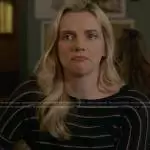 Leslie Knope (played by Amy Poehler) on Parks and Recreation on NBC was spotted wearing this navy striped sweater on Parks and Recreation on episode 'One Last Ride' (7x12) in Feb 2015. Leslie's Sweater is the Stripe Wool Blend Sweater in Coastal Combo by Vince .