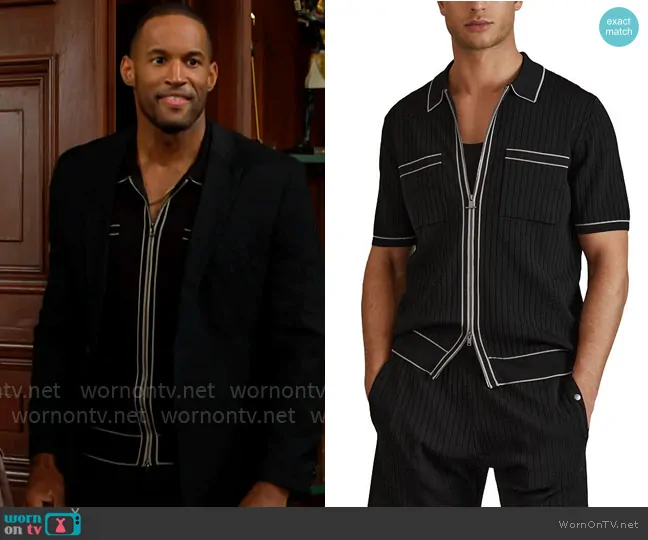 Carter Walton (played by Lawrence Saint-Victor) on The Bold and the Beautiful on CBS was spotted wearing this black knit zip up shirt with white trims on The Bold and the Beautiful on Oct 22 2024's episode. Carter's Shirt is the Christophe Shirt by Reiss .