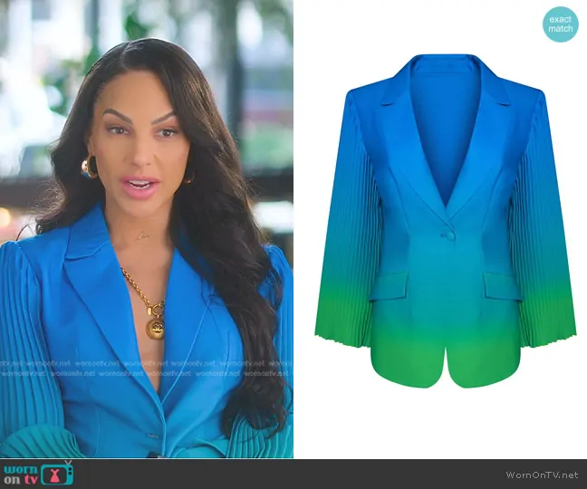 Amanza Smith on Selling Sunset on Netflix was spotted wearing this blue pleated sleeve blazer on Sep 09 2024's episode. Amanza's Jacket is the Ombre Blazer with Pleated Sleeve Detail by Arelias Dream.