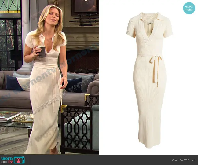 Catherina Greene (played by AnnaLynne McCord) on Days of our Lives on Peacock was spotted wearing this white ribbed crochet trim dress on Days of our Lives on Sep 11 2024's episode. Cat's Dress is the Rib Pencil Dress in Cream by Moon River.