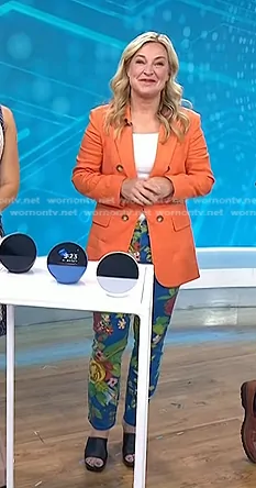 on Today on NBC was spotted wearing this orange blazer and blue floral pants on Today on Sep 11 2024's episode. 's Jacket is the Bexley Linen Blend Dickey Jacket by Veronica Beard . 's Pants is the The Dazzler Mid Rise Straight Jeans in Late Bloomer by Mother.