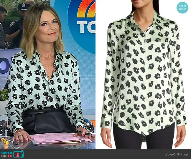 Savannah Guthrie on Today on NBC was spotted wearing this green floral blouse and black embroidered leather skirt on Today on Sep 12 2024's episode. Savannah's Top is the Essential Floral Blouse by Equipment . Savannah's Skirt is the Stacey Leather Lace Midi Skirt by Toccin.