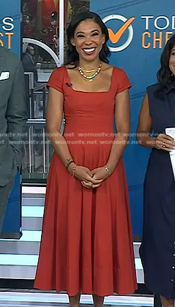 on Today on NBC was spotted wearing this red square neck midi dress on Today on Sep 12 2024's episode. 's Dress is the Wells A-Line Midi Dress in Rust by Staud.