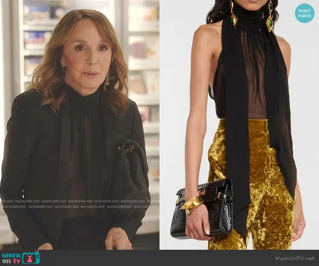 Sylvie (played by Philippine Leroy-Beaulieu) on Emily in Paris on Netflix was spotted wearing this black sleeveless sheer top on Emily in Paris on episode 'Lost in Translation' (4x07) in Sep 2024. Sylvie's Top is the Sleeveless Silk Blouse by Saint Laurent . Sylvie's Earrings is the Rivières Earrings in Smokey Quartz by Marie Helene de Taillac . Sylvie's Bag is the Calypso Large Bag by Saint Laurent.