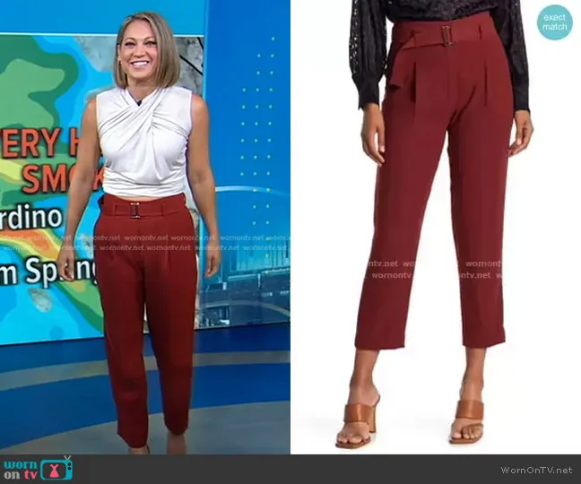Ginger Zee on Good Morning America on ABC was spotted wearing this twisted top and red belted patns on Good Morning America on Sep 13 2024's episode. Ginger's Pants is the Cacey Pleated Front Trousers by Reiss.
