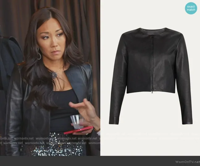 Katie Ginella on The Real Housewives of Orange County on Bravo was spotted wearing this black leather jacket on The Real Housewives of Orange County on episode 'Catwalks & Catfights' (18x10) in Sep 2024. Katie's Jacket is the Stretch Leather Long-Sleeve Cardigan Jacket by Susan Bender.