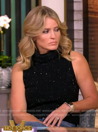 Sara Haines on The View on ABC was spotted wearing this black rhinestone embellished sleeveless top on The View on Sep 16 2024's episode. Sara's Top is the Alma Rhinestone Knit Shell by Alice and Olivia.