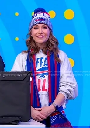 Lori Bergamotto on Good Morning America on ABC was spotted wearing this Buffalo Bills print sweatshirt on Good Morning America on Jan 24 2025's episode. Lori's Sweater is the Buffalo Bills Graphic Oversized Sunday Crew by NFL by Abercrombie.