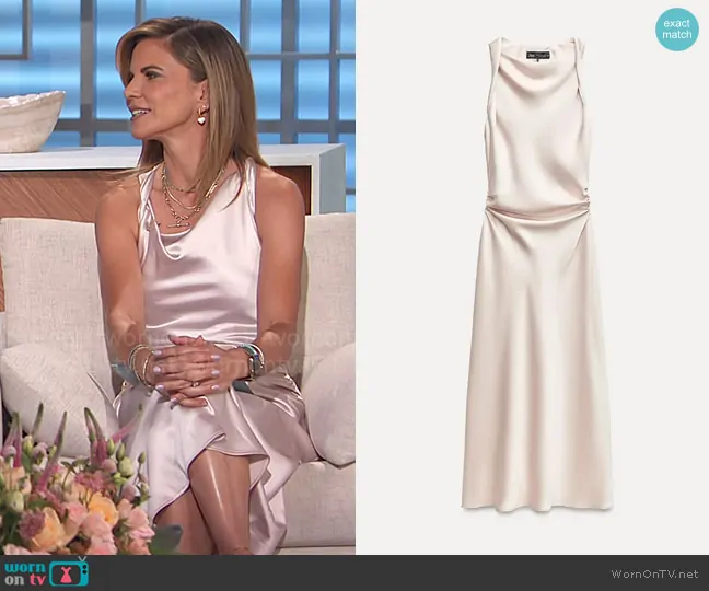 Natalie Morales on The Talk on CBS was spotted wearing this twisted satin midi dress on The Talk on Sep 16 2024's episode. Natalie's Dress is the Ruched Satin Effect Midi Dress by Zara . Natalie's Shoes is the Maureen Leather Mules by Malone Souliers.
