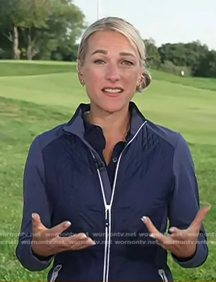 on Today on NBC was spotted wearing this navy contrast zip jacket on Today on Sep 16 2024's episode. 's Jacket is the Madeline Hybrid Full Zip Jacket by Peter Millar.