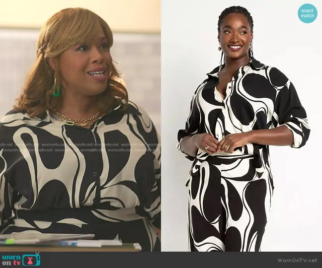 Krystal Walters (played by Angela Grovey) on Reasonable Doubt on Hulu was spotted wearing this black and white print blouse and pants on Reasonable Doubt on episode 'Guilty Until Proven Innocent' (2x05) in Sep 2024. Krystal's Top is the Printed Button Down in Cookies And Cream by Eloquii . Krystal's Pants is the Printed Wide Leg Pant in Cookies And Cream by Eloquii.