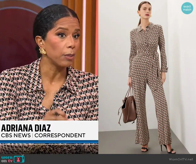 Adriana Diaz on CBS Mornings on CBS was spotted wearing this geometric print jumspuit on CBS Mornings on Sep 19 2025's episode. Adriana's Jumpsuit is the Michele Jumpsuit by Diane von Furstenberg .