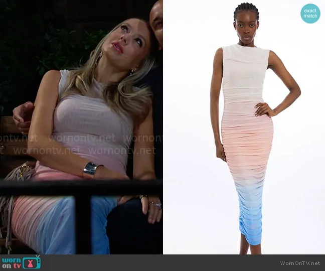 Abby Newman (played by Melissa Ordway) on The Young and the Restless on CBS was spotted wearing this ombre ruched mesh dress on The Young and the Restless on Sep 17 2024's episode. Abby's Dress is the Sunset Ombre Mesh Ruched Jersey Maxi Dress by Karen Millen .