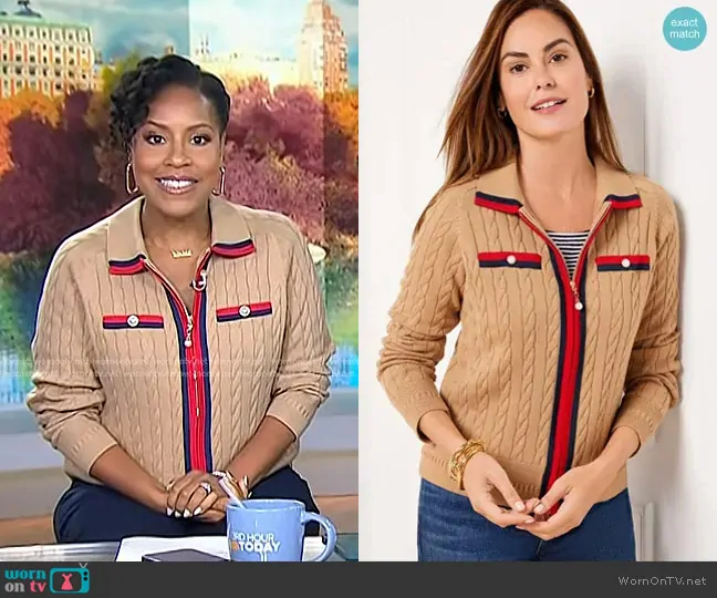Sheinelle Jones on Today on NBC was spotted wearing this beige cable knit zip front sweater on Today on Dec 26 2024's episode. Sheinelle's Sweater is the Cable Knit Sweater in Toasted Coconut/Indigo by Talbots.
