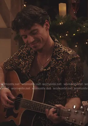 Benoit (played by Kevin Dias) on Emily in Paris on Netflix was spotted wearing this printed gold lace shirt on Emily in Paris on episode 'Ringarde' (4x06) in Sep 2024. 's Shirt is the Black Lace Gold Short Sleeeve Cuban Peacock Shirt by Phix.