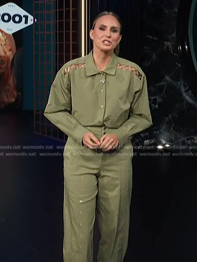 Keltie Knight on E! News on E! was spotted wearing this green chain detail shirt and studded pants on E! News on Sep 18 2024's episode. Keltie's Top is the Openwork shirt by Maje . Keltie's Pants is the Studded Wide Leg Trousers by Maje.