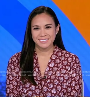 on Good Morning America on ABC was spotted wearing this red printed wrap top on Good Morning America on Sep 19 2024's episode. 's Top is the Faux Wrap Blouse by Pleione.