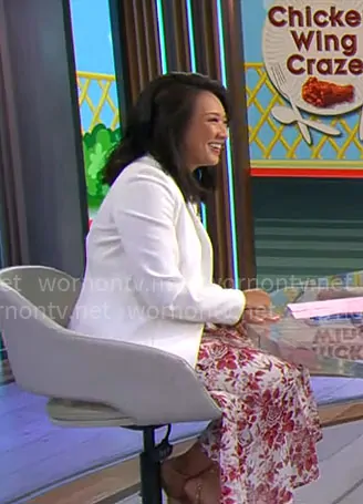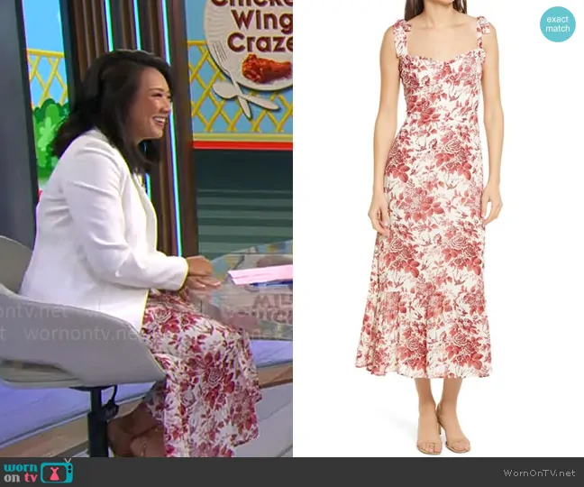 Nancy Chen on CBS Mornings on CBS was spotted wearing this red floral dress on CBS Mornings on Sep 20 2024's episode. Nancy's Dress is the Nikita Midi Dress In Toile De Jouy by Reformation .