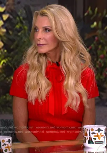 on The View on ABC was spotted wearing this red tie neck sweater top on The View on Sep 20 2024's episode. 's Top is the Abbott Short-Sleeve Collared Tie Pullover by Alice + Olivia . 's Skirt is the Siobhan Faux Wrap Pencil Skirt by Alice + Olivia.