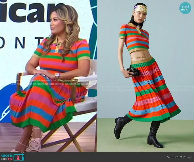 on Good Morning America on ABC was spotted wearing this multicolor striped polo and skirt on Good Morning America on Sep 20 2024's episode. 's Top is the Viscose Blend Striped Polo Top by Gucci . 's Skirt is the Viscose Blend Striped Skirt by Gucci.