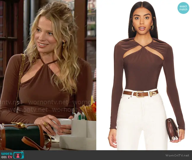 Summer Newman (played by Allison Lanier) on The Young and the Restless on CBS was spotted wearing this brown long sleeved top with cutouts on The Young and the Restless on Sep 23 2024's episode. Summer's Top is the Delilah Bodysuit in Espresso Brown by Lovers + Friends . Summer's Skirt is the Pegu Skirt by Babaton at Aritzia . Summer's Bag is the Snake Print Chain-Strap Bag in Chocolate by Charles & Keith . Summer's Shoes is the Creativity Slingback Pump in Tortoise by Jeffrey Campbell.