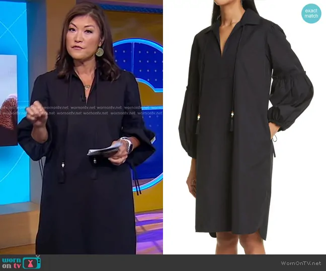 Juju Chang on Good Morning America on ABC was spotted wearing this black tassel dress on Good Morning America on Sep 23 2024's episode. Juju's Dress is the Fedora Tasseled Cotton-poplin Dress in Black by Max Mara.