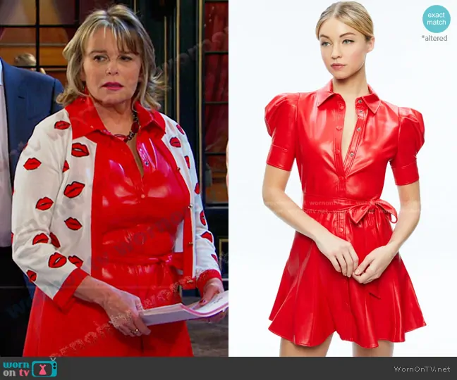 Bonnie Lockhart (played by Judi Evans) on Days of our Lives on Peacock was spotted wearing this red leather dress and lip print cardigan on Days of our Lives on Sep 24 2024's episode. Bonnie's Dress is the Lurlene Faux Leather Mini Dress by Alice + Olivia . Bonnie's Sweater is the Daroda Wool Kiss Crop Cardigan in Soft White Multi by Alice + Olivia.