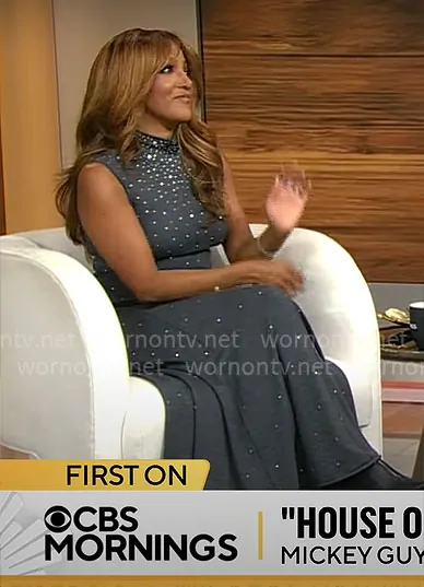 on CBS Mornings on CBS was spotted wearing this grey embellished maxi dress on CBS Mornings on Sep 25 2024's episode. 's Dress is the Ristrassy Rhinestone Knit Maxi Dress by Maje .