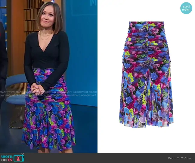 Eva Pilgrim on Good Morning America on ABC was spotted wearing this fruit print ruched skirt on Good Morning America on Sep 25 2024's episode. Eva's Skirt is the Gonna Skirt by Fuzzi.
