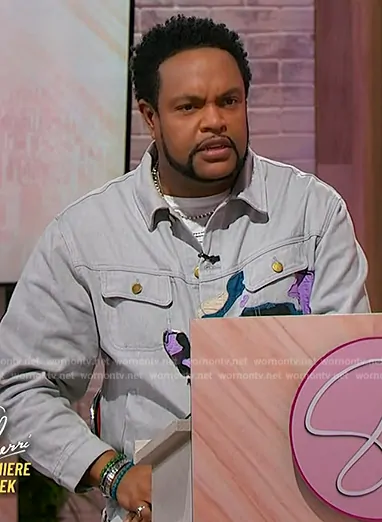 Jawn Murray on Sherri on FOX was spotted wearing this embroidered jacket and pants on Sherri on Sep 25 2024's episode. Jawn's Jacket is the Face Embroidered Denim Jacket by Kidsuper . Jawn's Pants is the Face-embroidered straight-leg jeans by Kidsuper.