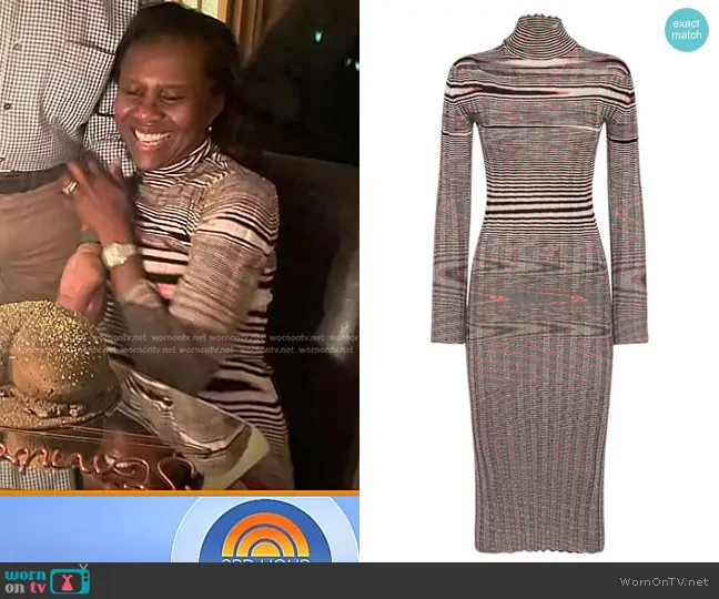 on Today on NBC was spotted wearing this striped knit dress on Today on Sep 25 2024's episode. 's Dress is the Ribbed Cashmere Turtleneck Midi Dress by Missoni.