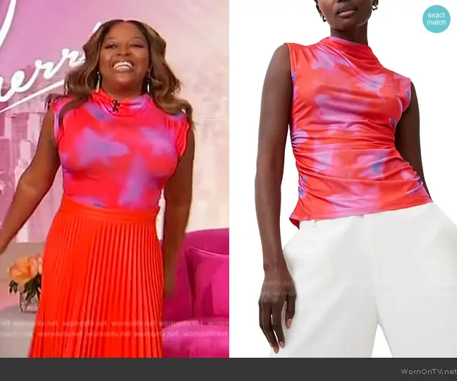 Sherri Shepherd on Sherri on FOX was spotted wearing this red ruched sleeveless top on Sherri on Sep 26 2024's episode. Sherri's Top is the Riya Christy Printed Ruched Top by French Connection.