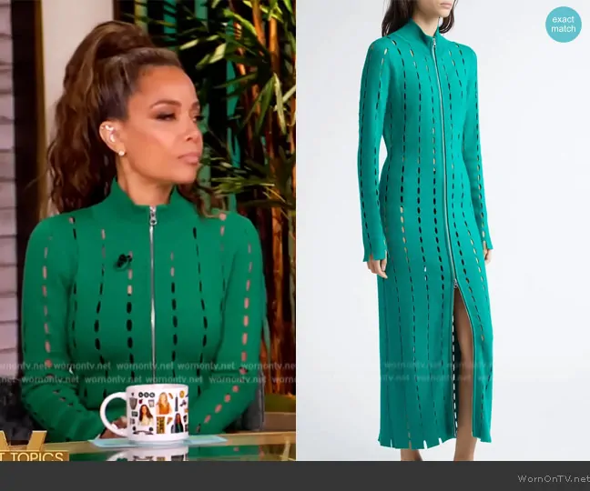 Sunny Hostin on The View on ABC was spotted wearing this green cutouts long sleeve dress on The View on Sep 26 2024's episode. Sunny's Dress is the Anatonia Allover Cutout Zip Longline Cardigan by Zankov.