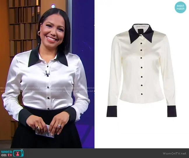 Alice + Olivia Willa Silk Fitted Shirt in Off White/ Black worn by Stephanie Ramos on Good Morning America