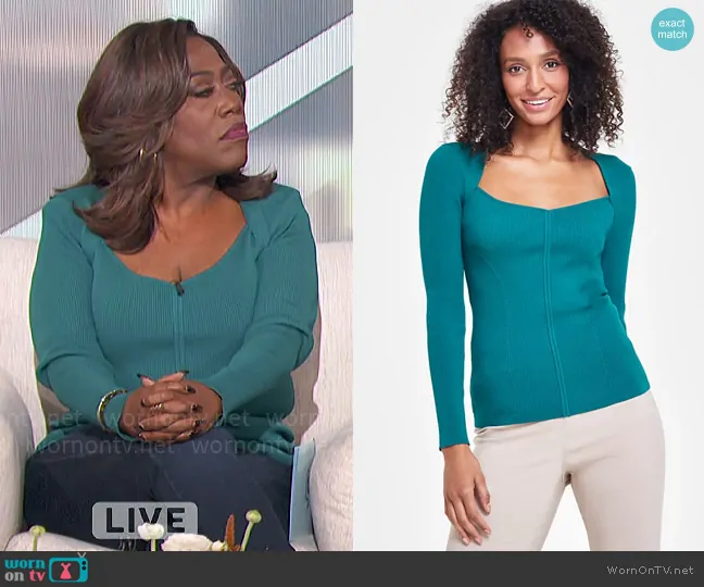 Sheryl Underwood on The Talk on CBS was spotted wearing this teal rib knit long sleeve top on The Talk on Sep 26 2024's episode. Sheryl's Top is the Ribbed Long-Sleeve Sweater in Green Tourmaline by INC International Concepts.