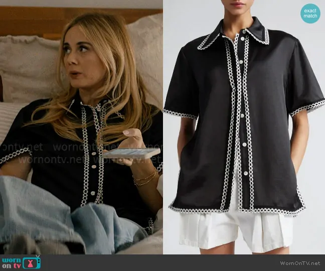 Morgan (played by Justine Lupe) on Nobody Wants This on Netflix was spotted wearing this black shirt with white embroidered trim on Nobody Wants This on episode 'Obliterated' (1x04) in Sep 2024. Morgan's Top is the Lace Trim Short Sleeve Button-Up Shirt by Eenk.
