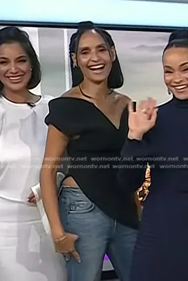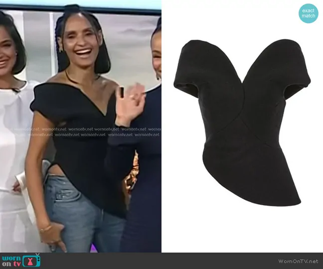 on Today on NBC was spotted wearing this black asymmetric top on Today on Sep 27 2024's episode. 's Top is the Cashmere Off the Shoulder Sweetheart Top by Brandon Maxwell.