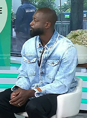 on Today on NBC was spotted wearing this frayed denim shirt jacket on Today on Sep 27 2024's episode. 's Shirt is the Frayed Denim Overshirt in Light Blue by Versace.