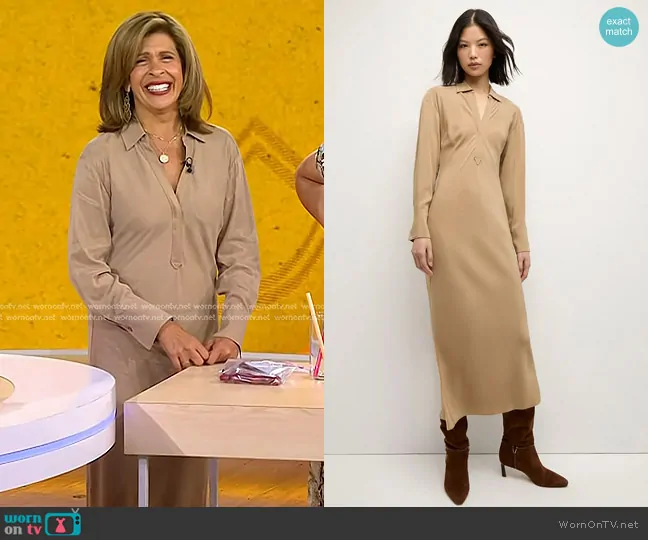 Hoda Kotb on Today on NBC was spotted wearing this beige collared long sleeve dress on Today on Oct 10 2024's episode. Hoda's Dress is the Liberty Dress in Russet by Veronica Beard.
