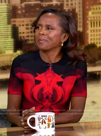on The View on ABC was spotted wearing this black and red printed dress on The View on Sep 27 2024's episode. 's Dress is the Jacquard-knit mini dress by Alexander McQueen.