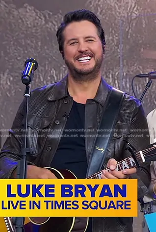 on Good Morning America on ABC was spotted wearing this Luke Bryan’s brown leather jacket on Good Morning America on Sep 30 2024's episode. 's Jacket is the Perforated Leather Shirt Jacket by Dolce & Gabbana.